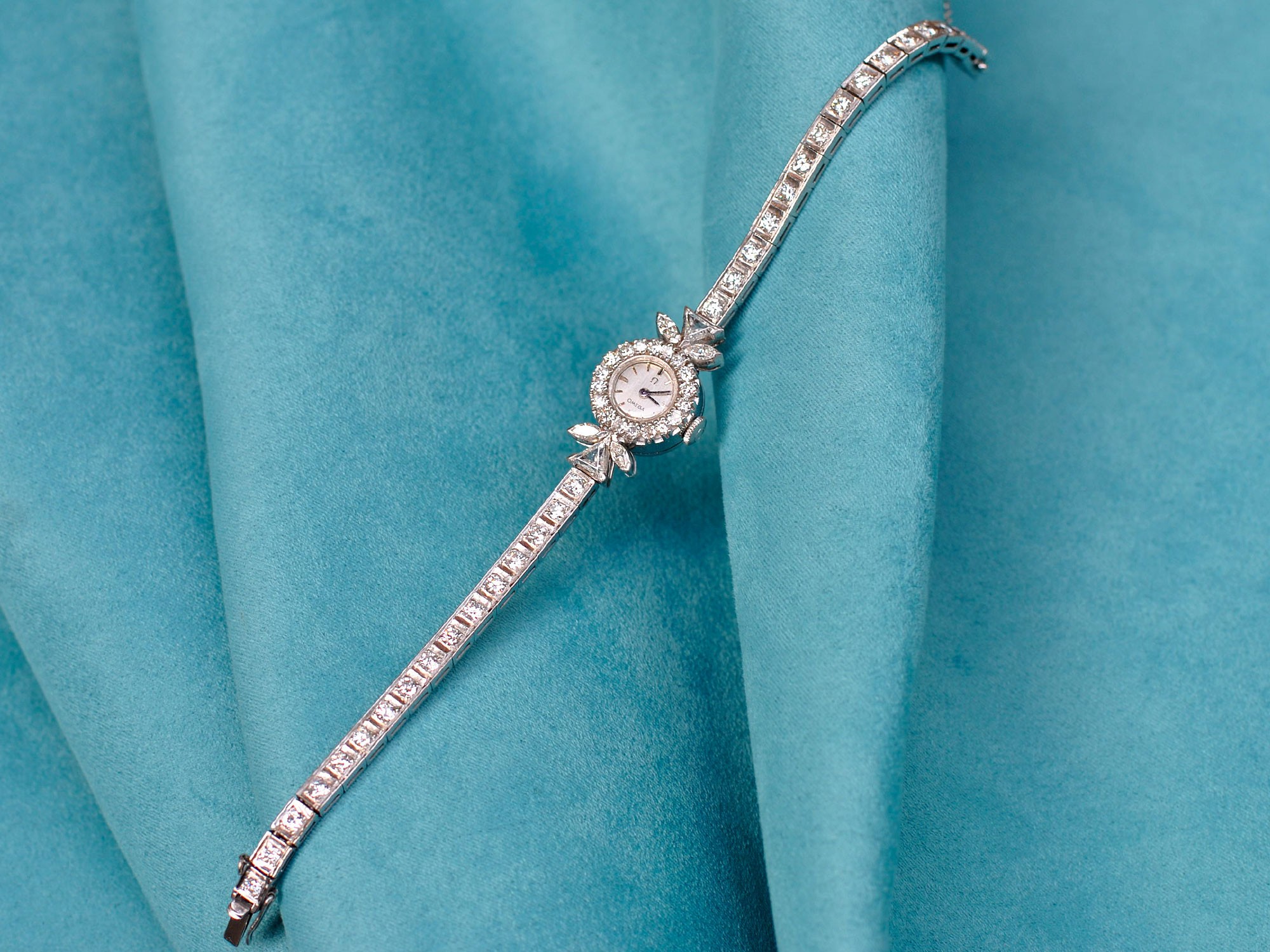 Elegant and refined, this 1950 Omega is a true vintage jewel. Crafted in platinum, it features a delicate case framed by a radiant halo of brilliant-cut diamonds. The platinum bracelet is also adorned with diamonds, totaling approximately 4 carats, gracefully arranged among geometric elements and leaf-shaped details. The dial is understated and feminine, reflecting the timeless sophistication of mid-century Swiss watchmaking. A precious piece that combines fine craftsmanship, vintage charm, and exceptional brilliance.