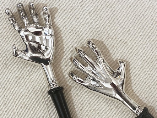 This extraordinary back scratcher elevates an everyday object to a collectible work of art. The hand, made entirely of silver, is embellished with a series of engraved vintage coats of arms that reveal its noble inspiration, all balanced by a simple handle in turned ebony wood.