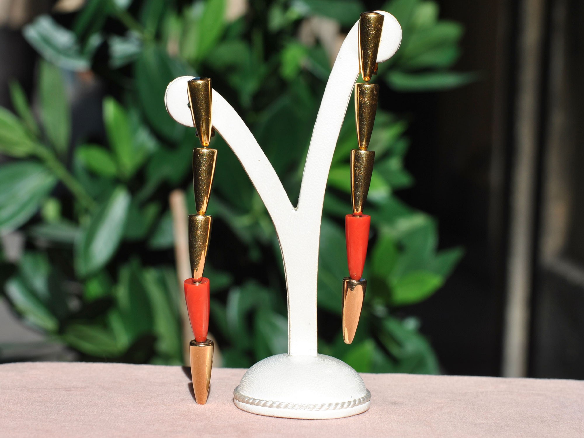 Made of yellow gold, they feature a slender and harmonious design that enhances the natural beauty of Mediterranean red coral, carefully carved to highlight its veins and warm tones.