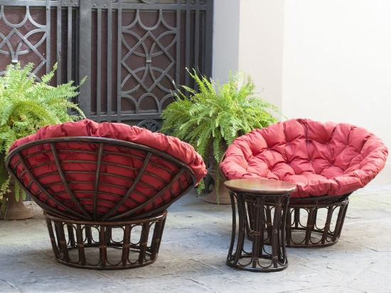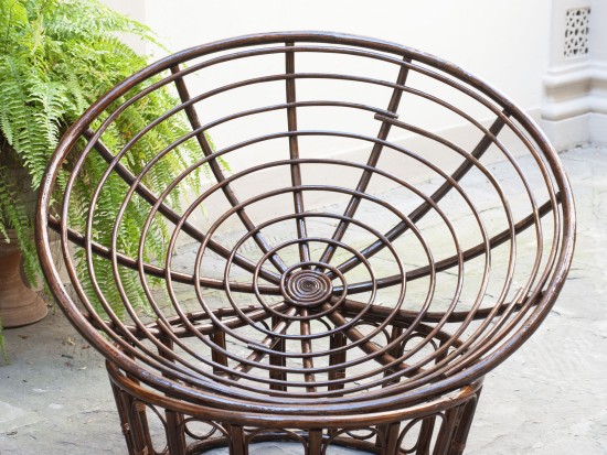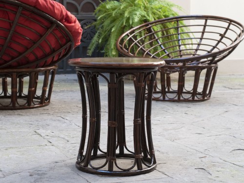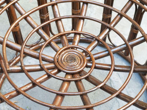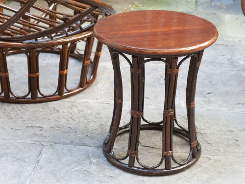 Elegant 1970s rattan armchairs with an enveloping, rounded design, featuring a woven structure and a sturdy base. The seating is made even more comfortable by soft, padded cushions. The matching side table, with a removable top, combines practicality and style. Perfect for outdoor use, this set adds character and refinement to terraces and gardens, creating a welcoming and sophisticated atmosphere with a distinctive vintage touch.