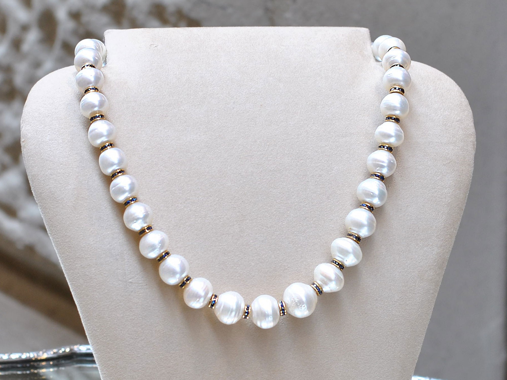 Each perfectly round pearl with a silky surface is separated by interludes of yellow gold and intense blue sapphires, which add depth and a touch of vibrant color to the composition.
