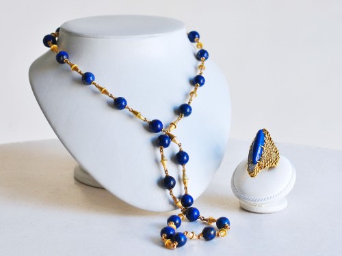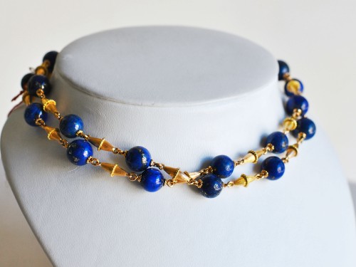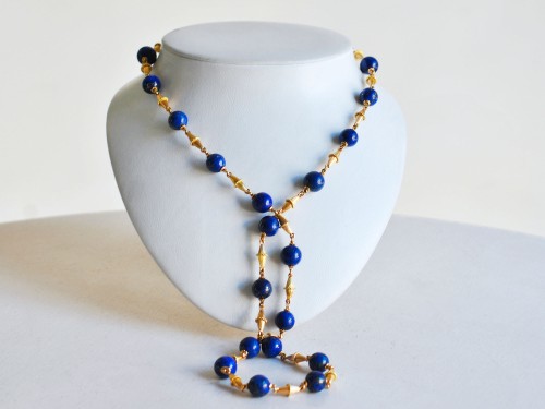 The lapis lazuli spheres, with their deep blue hues and golden reflections, intertwine harmoniously with the gold elements, creating a refined and meaningful piece of jewelry.