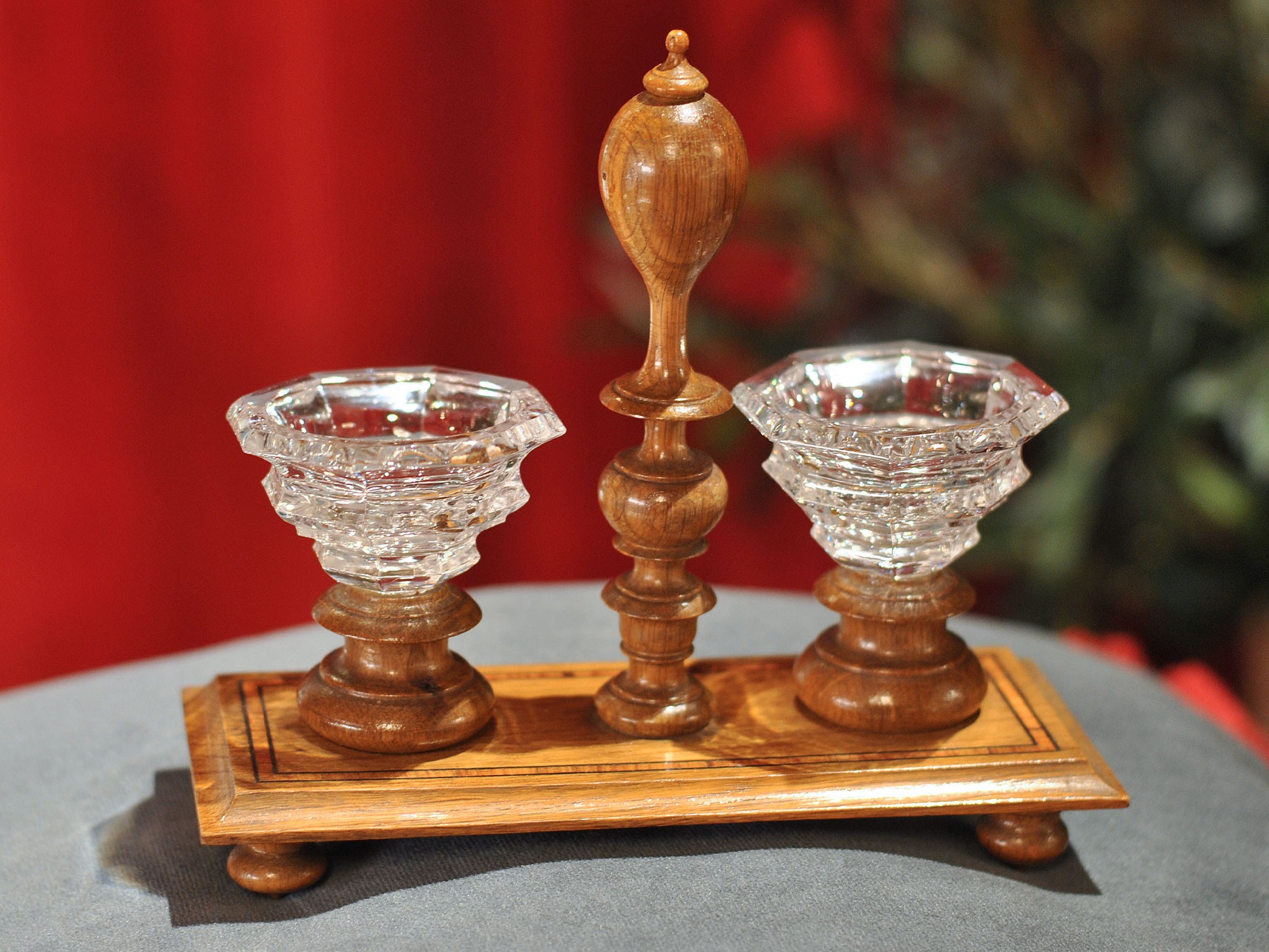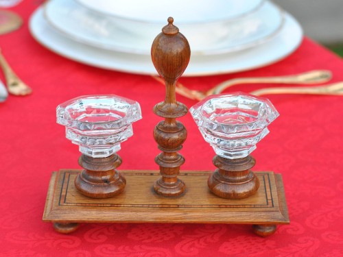 On either side of the handle are two small crystal cups, one for salt and one for pepper, whose luminous transparency creates a pleasant contrast with the natural wood. The whole reflects the taste and savoir-faire of late 19th-century France, where functionality and elegance come together in a practical yet decorative table accessory.