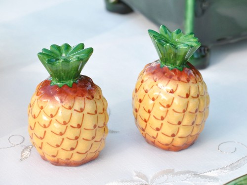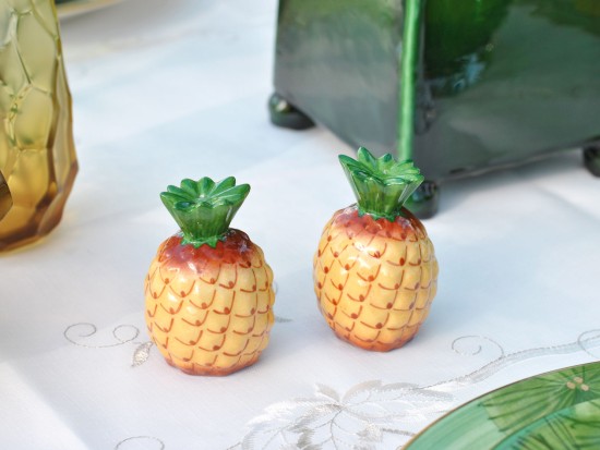 We present a charming pair of French ceramic salt and pepper shakers representing two cheerful, colorful pineapples to display on your table.