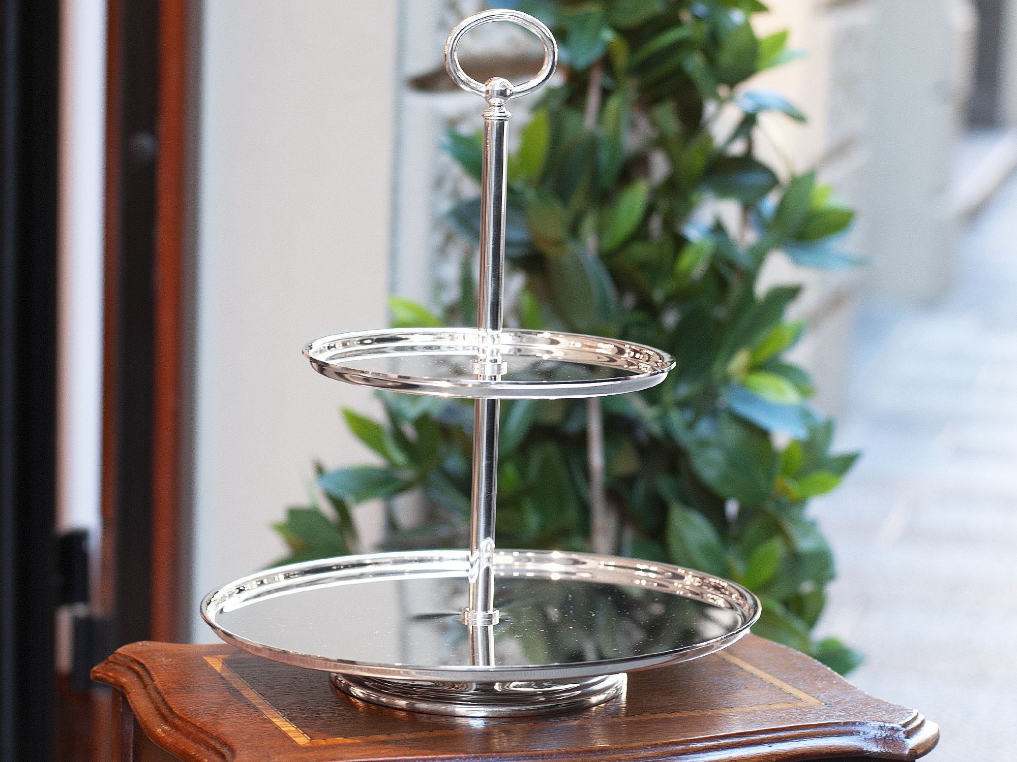 Made of high-quality silver-plated metal, this cake stand is designed to enhance any table setting, whether classic or contemporary.