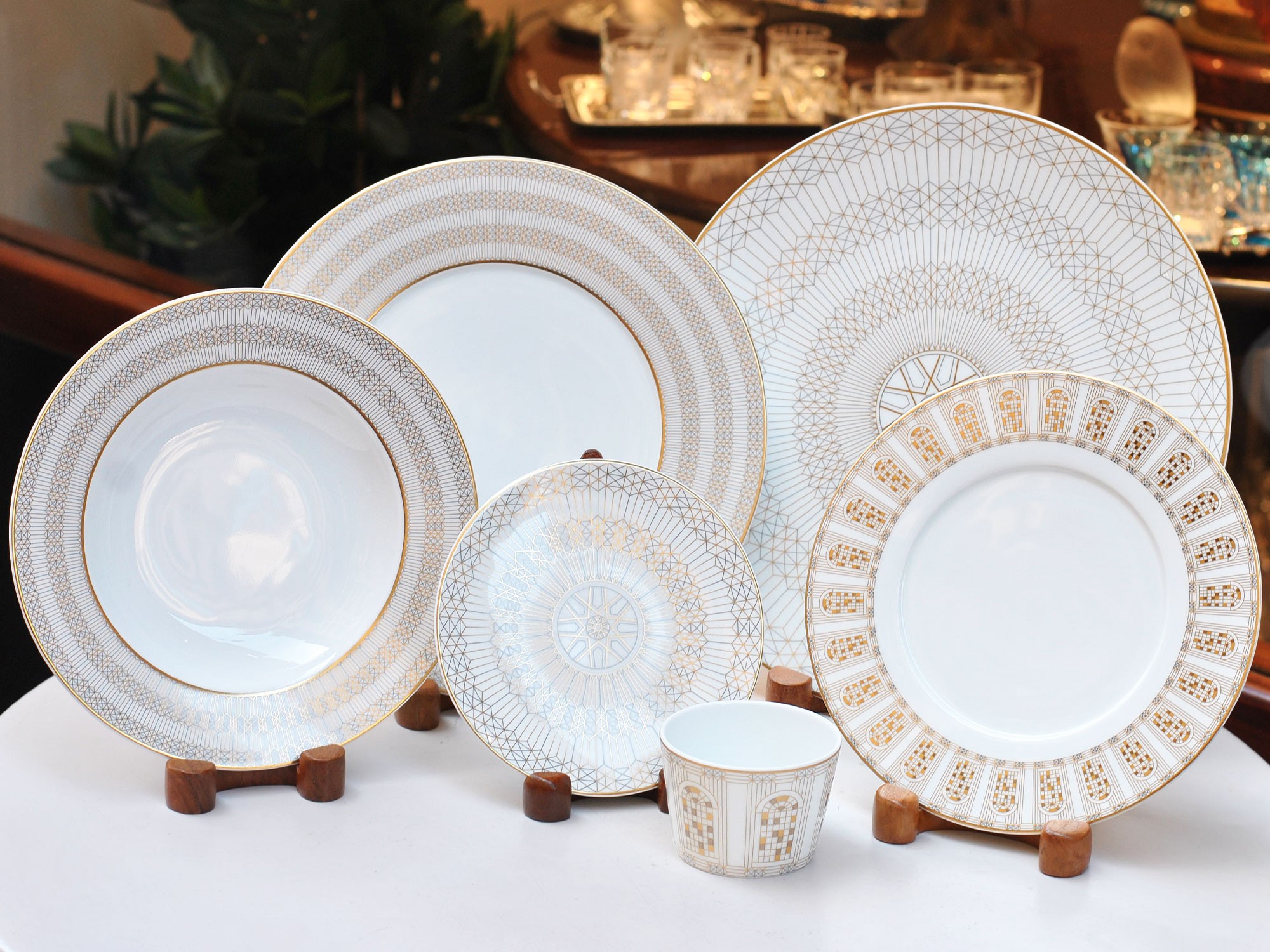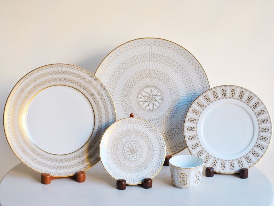 The Arcadia collection in Gold and White is a porcelain service that includes four plate sizes and one for the Tumbler.