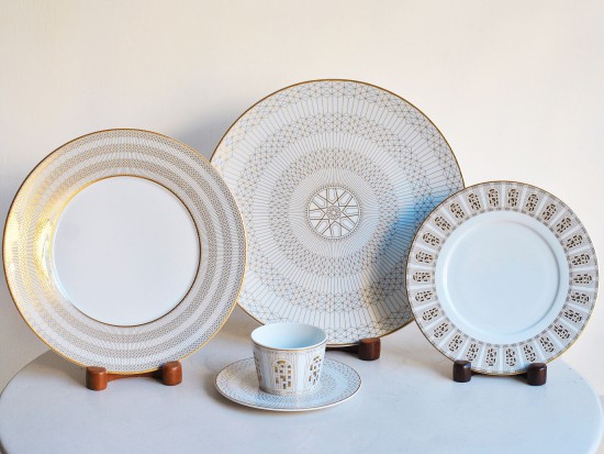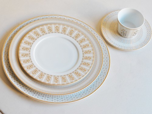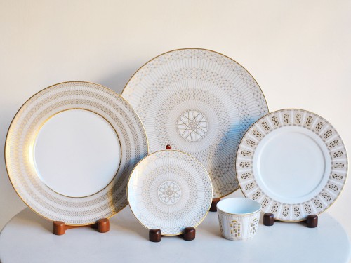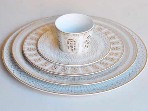 The dazzling white porcelain is embellished with golden details reminiscent of the carved motifs of the Maison's crystal creations.