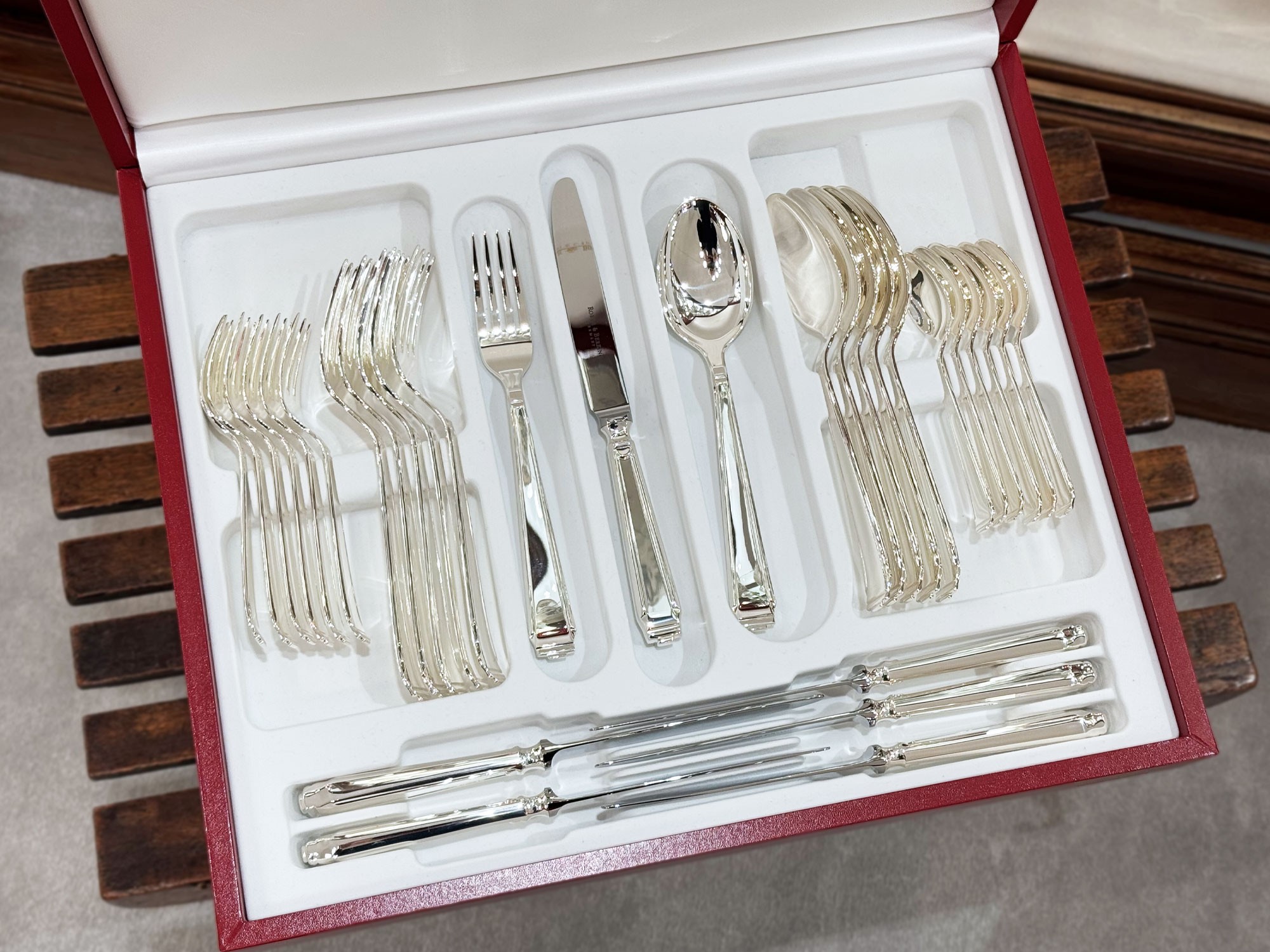 Each place setting consists of a double table fork, a table spoon, a table knife with a dessert fork, a dessert knife, a dessert spoon, a tea spoon, and a coffee spoon.
