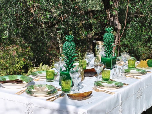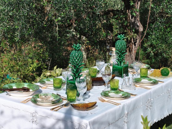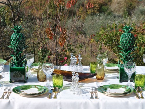 The “Pini Toscani” tableware by Este Ceramiche dresses the table in green and gold, evoking the foliage of Mediterranean pine trees.