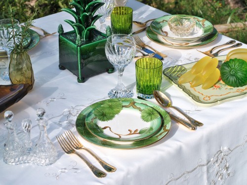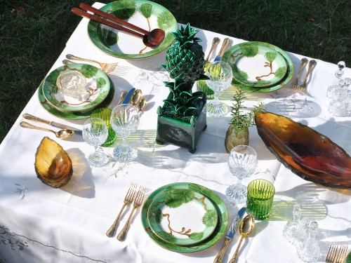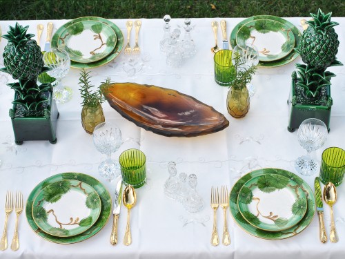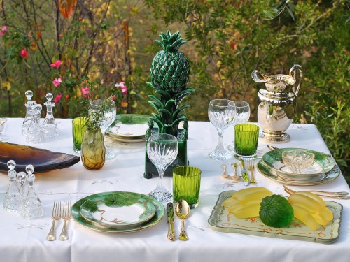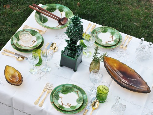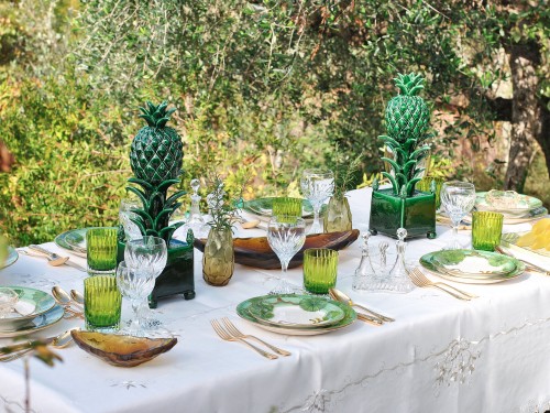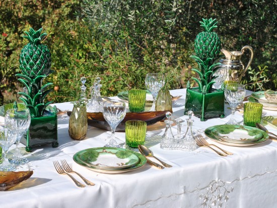 At the center, the beautiful amber-colored centerpiece by Lalique from the new “Silex Box” collection diffuses warm golden hues, while Jean Roger's iconic green ceramic sculptures in the shape of pineapples add a dramatic touch.