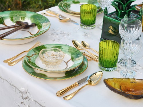 Ercuis gold cutlery and Baccarat glasses complete with refinement a mise en place that combines nature, craftsmanship, and discreet luxury.