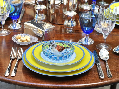 Each place setting consists of a double table fork, a table spoon, a table knife with a dessert fork, a dessert knife, a dessert spoon, a tea spoon, and a coffee spoon.