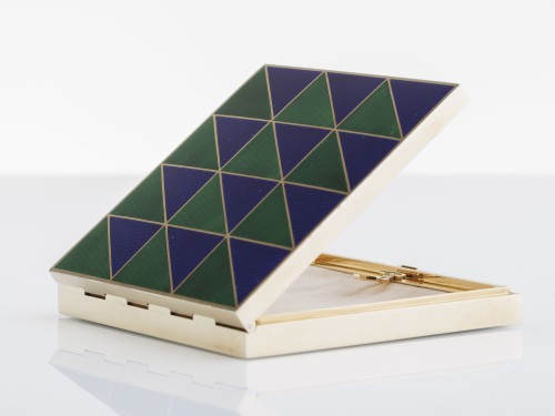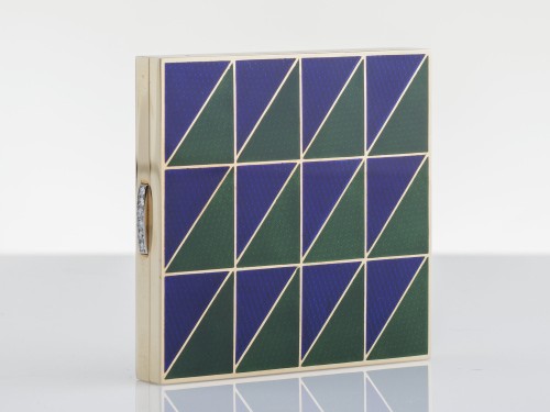 This elegant box is an original creation by Parenti Firenze, skillfully crafted in yellow gold and decorated with a sophisticated geometric pattern in blue and green enamel. The lid is adorned with a regular sequence of equilateral triangles, alternating in two colors and separated by thin gold lines.