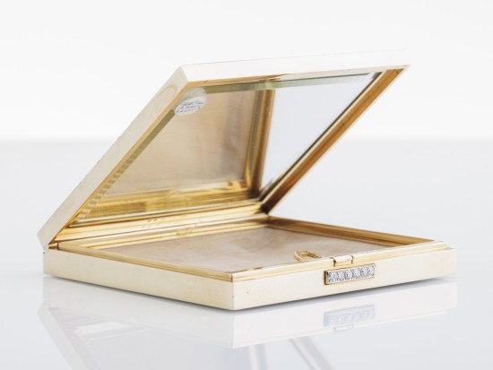 The interior houses a large mirror, while the base contains an opening compartment, protected by a thin metal mesh, designed to hold powder or small precious objects in an elegant and secure manner.