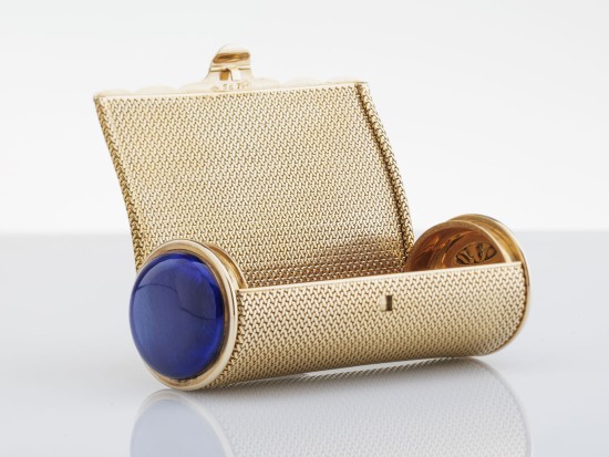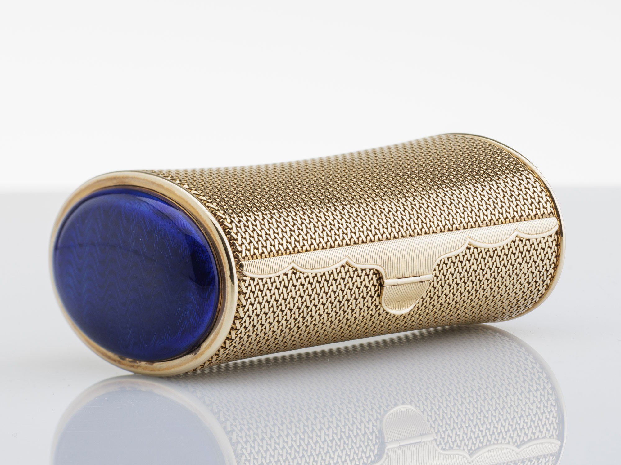 Delightful little box in gold and lapis lazuli blue enamel, made using such a unique technique that it transforms the precious metal into something resembling a soft, sturdy fabric. It is so captivating to touch and hold in your hand that you can imagine it being taken out of an elegant handbag from another era and opened by gentle hands to retrieve a lipstick, perfume, or any other object that contributes to its graceful harmony.