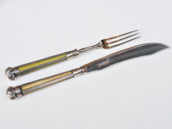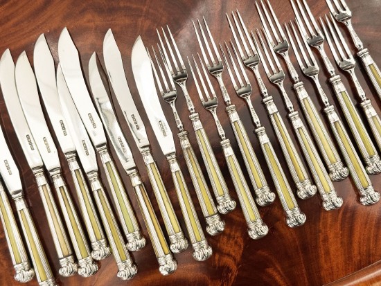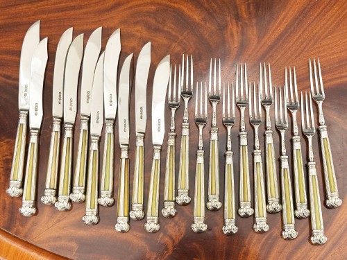 Refined Old Sheffield fish cutlery set from 1889, made of silver and embellished with elegant engraved coats of arms, evidence of high-quality production intended for a prestigious table. The silver blades and functional parts reflect the typical quality of late 19th-century English tradition, while the silver and bakelite handles offer a refined contrast of materials, combining solidity, balance, and decorative taste.
