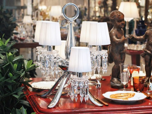 The magnificent design, eccentrically conceived by the volcano of ideas Philippe Starck, combines transparent crystal with pink and veiled crystal, combining them with decorations