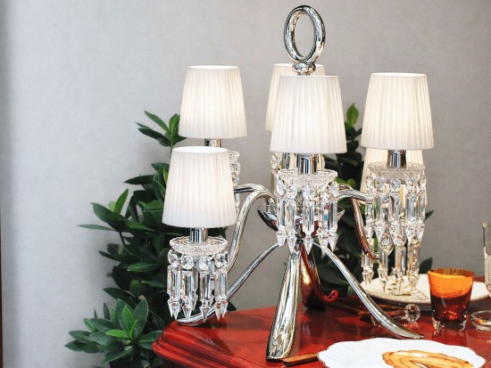 This refined Baccarat table lamp is a magnificent example of contemporary design combined with the elegance of handcrafted crystal. The structure consists of six finely curved polished steel arms that open harmoniously to support the transparent crystal lamp holders from the Zenith Nomade line.