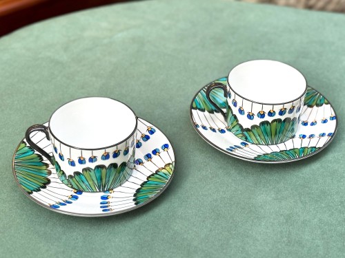 The Bahia tea set by Alberto Pinto offers the same bright, tropical atmosphere as the collection, featuring cups and saucers in fine Limoges porcelain. Entirely hand-painted, the decorations feature subtle lines and colorful geometric patterns that enhance the rim and soft shape of the cups.