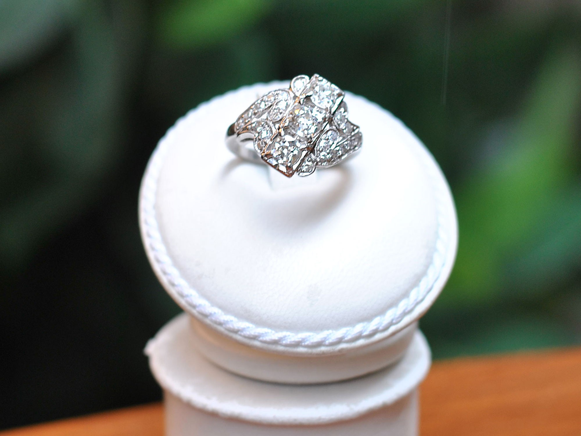 Elegante anello impreziosito da una composizione geometrica di diamanti taglio brillante.