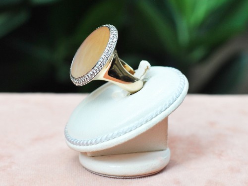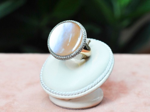 Un gioiello firmato Vhernier che incarna grazia e femminilità: questo incantevole anello presenta una luminosa Pietra di Luna rotonda, dalle delicate sfumature madreperlacee, che cattura la luce con un effetto etereo e cangiante.