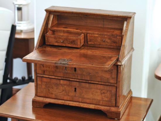 Realizzata in noce e altre tipologie di legni o radica con calde venature, presenta un piano ribaltabile che, una volta aperto, forma una superficie di scrittura.