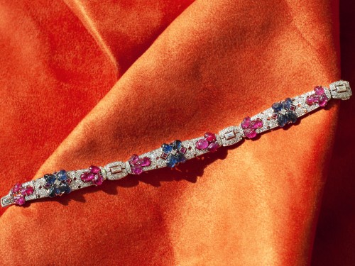 Tra i raggi scintillanti delle gemme, delicati fiorellini di zaffiri blu notte e rubini luminosi si intrecciano come un giardino segreto inciso nella luce, creando un contrasto cromatico di rara suggestione. Ogni dettaglio rivela la maestria orafa e il gusto sofisticato degli anni Trenta, quando la modernità incontrava il sogno.