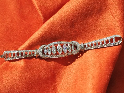 Raffinato esempio di alta gioielleria d’epoca, questo bracciale in Platino incastonato di Diamanti unisce equilibrio geometrico e luminosità straordinaria, tipici dello stile Art Déco.
