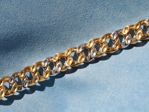 Bracciale in oro dal design elegante e dinamico, composto da maglie intrecciate che creano un raffinato gioco di movimento e luce. Ogni elemento è impreziosito da pietre preziose: Zaffiri blu profondi e Rubini rosso intenso si alternano armoniosamente, accompagnati da luminosi Diamanti che ne esaltano la brillantezza. La lavorazione accurata e la disposizione sinuosa delle gemme conferiscono al gioiello un aspetto sofisticato e senza tempo, perfetto per aggiungere un tocco di colore e lusso a qualsiasi look.