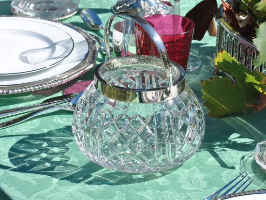 Oggetto ideale per accompagnare momenti speciali, ricevimenti all’aperto o per essere esposto come pezzo da collezione. Si adatta perfettamente a tavole sofisticate, come mostrato nell’immagine, dove spicca tra stoviglie di porcellana fine, bicchieri colorati e posate d’argento.