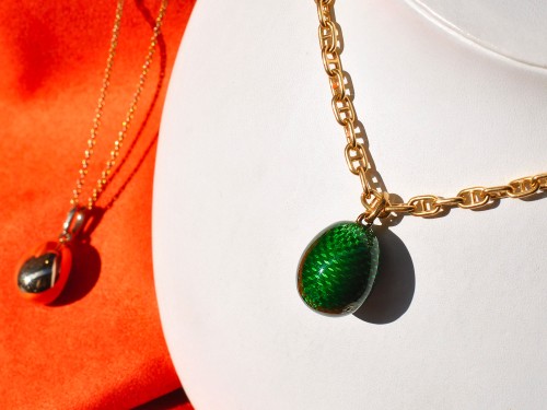 Raffinato pendente a forma di uovo realizzato in oro pieno, impreziosito da una smaltatura gialla intensa e luminosa. La superficie leggermente lavorata riflette la luce con eleganza, esaltando le sfumature profonde del Verde e il calore dell’oro. Il design essenziale ma ricercato richiama uno stile senza tempo, perfetto per aggiungere un tocco di carattere e sofisticatezza a qualsiasi look. Un gioiello distintivo, ideale sia per l’uso quotidiano che per occasioni speciali, che unisce artigianalità e fascino classico.