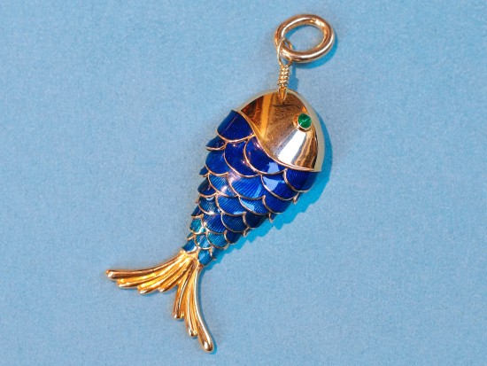 Il Pesce presenta scaglie di splendido e vivo colore, occhi formati da Cabochon di Smeraldi, Smalti di perfetta lavorazione evidenzianti Vivi Chiaro Scuri.
