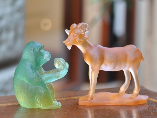 La scultura “Monkey Fishing” di Daum, realizzata in pasta di cristallo e dai riflessi cangianti nei toni del giallo e del verde, cattura l'essenza della natura.