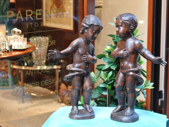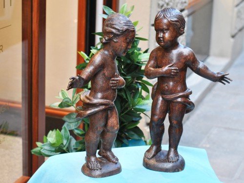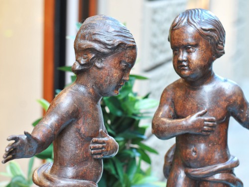 Raffinata coppia di sculture lignee raffiguranti due bambini in atteggiamento dialogante, realizzate in Francia nel XVII secolo.