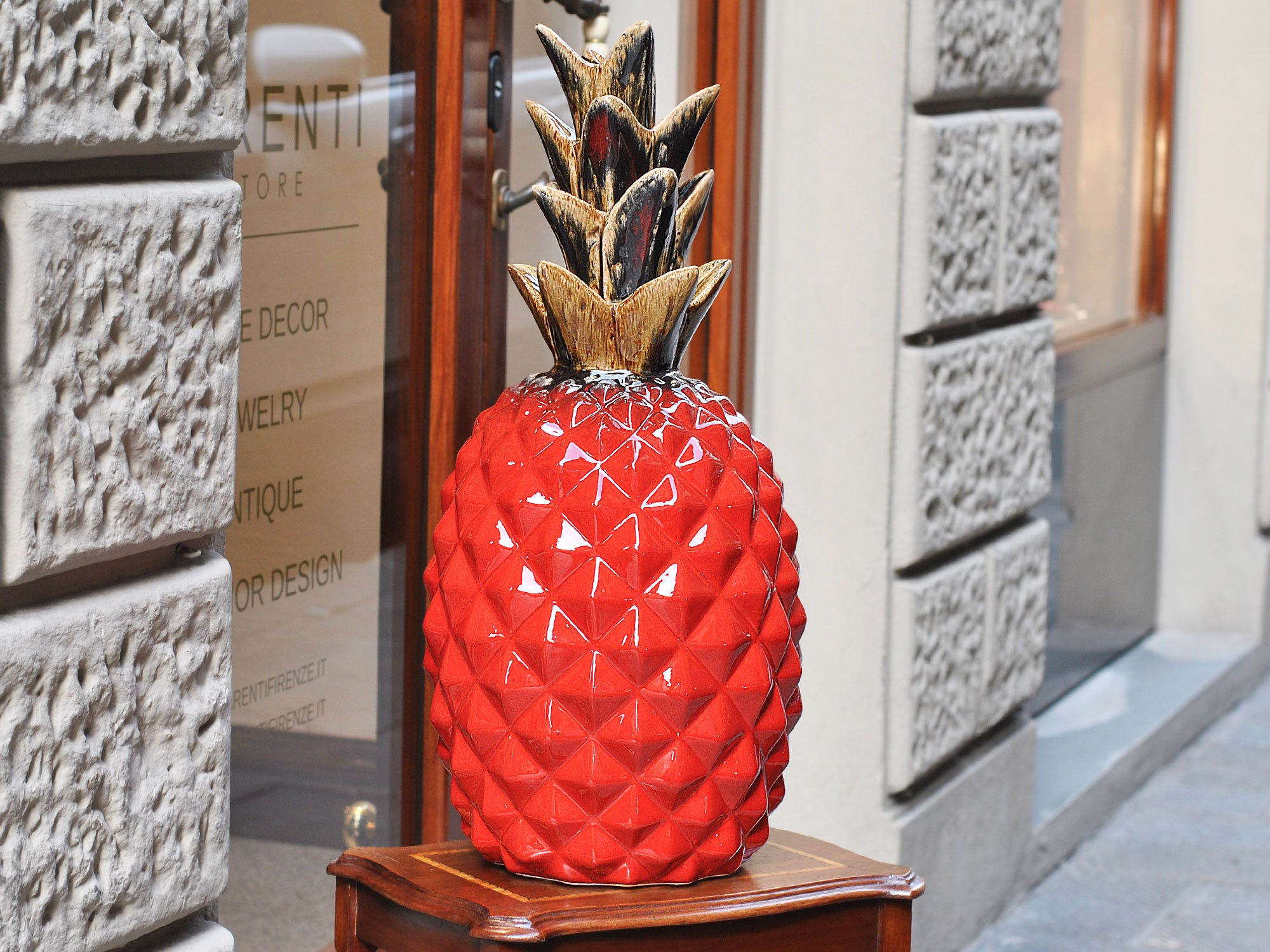 Una splendida bellissima scultura di ananas di un colore vibrante rosso che trasmette passione e allegria.