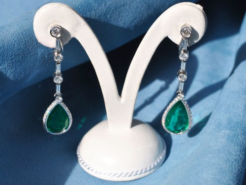 La composizione culmina con due splendide gocce di smeraldo, di intenso colore verde, incorniciate da un delicato pavé di diamanti che ne esalta la profondità e la brillantezza. L’armonia tra il bianco luminoso dei diamanti e il verde vibrante degli smeraldi crea un contrasto elegante e sofisticato.