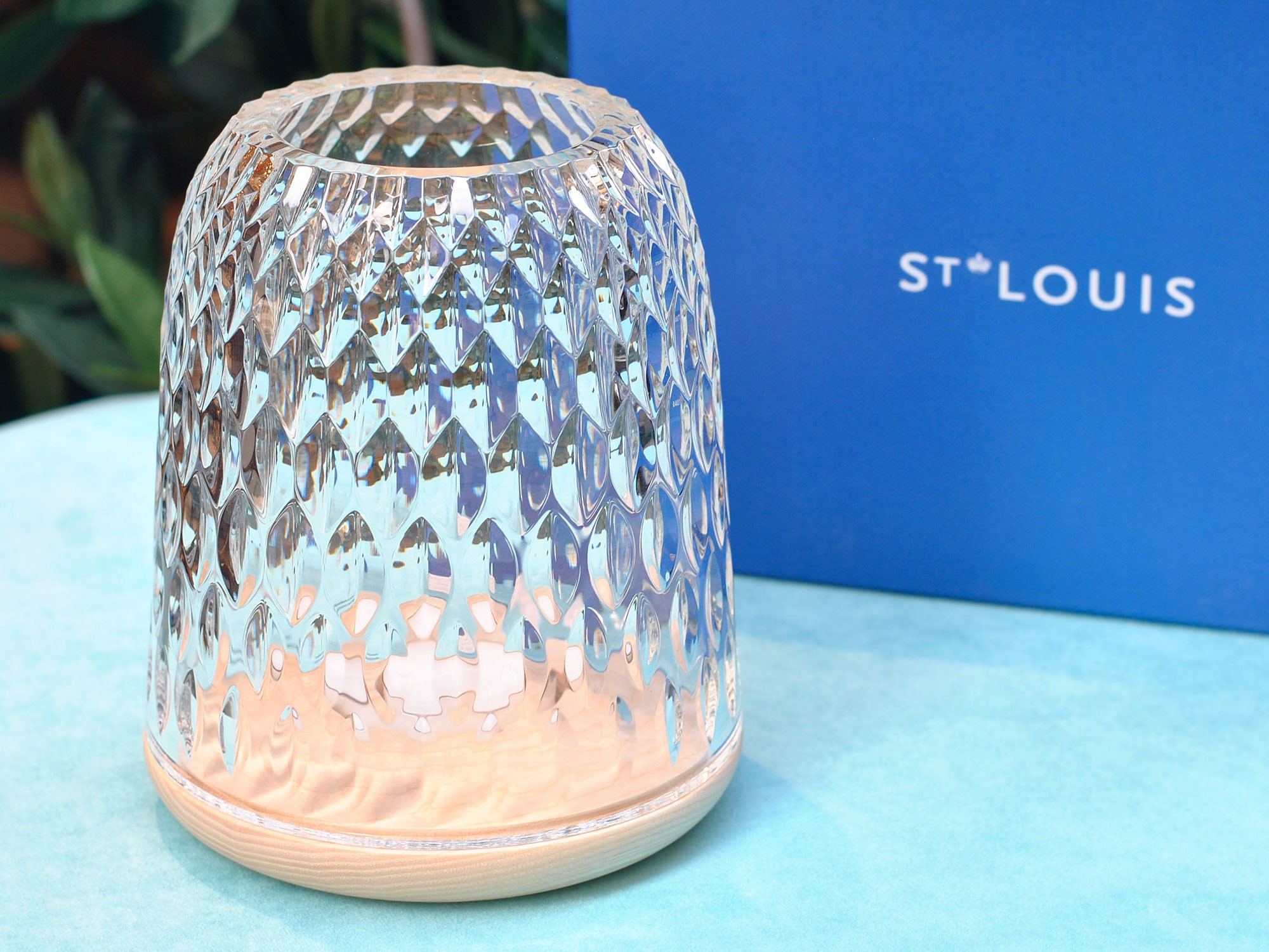 La mini lampada portatile Folia incarna la firma luminosa della Maison: una luce amplificata dal cristallo molato.