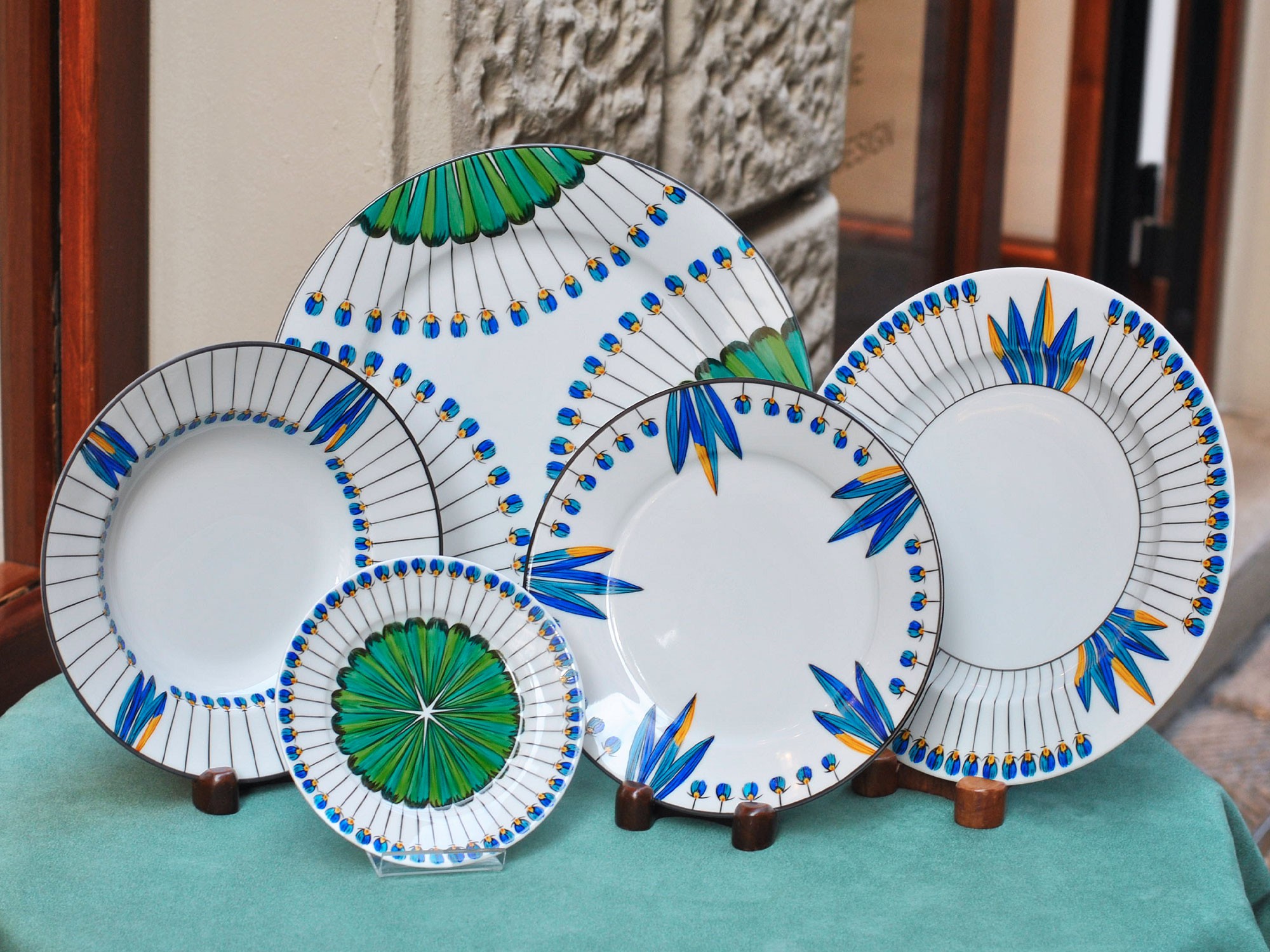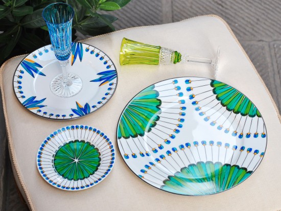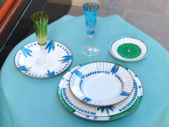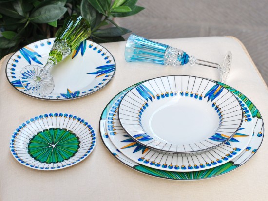 Il servizio da tè Bahia di Alberto Pinto propone la stessa atmosfera luminosa e tropicale della collezione, declinata su tazze e piattini in finissima porcellana di Limoges. Interamente dipinte a mano, le decorazioni presentano linee sottili e geometrie colorate che valorizzano il bordo e la forma morbida delle tazze.
