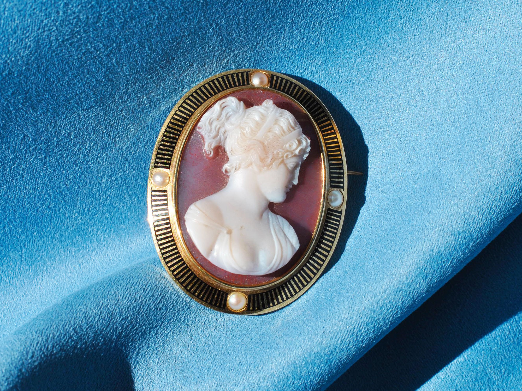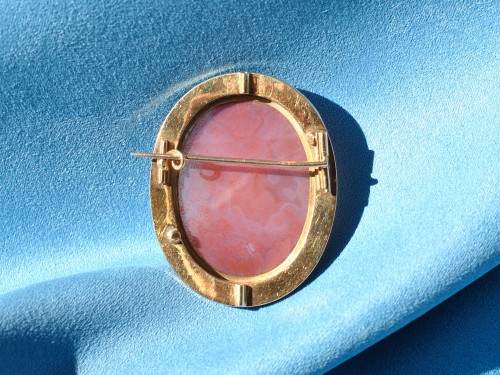 Cammeo ovale degli anni ’40 raffigurante un profilo femminile in stile neoclassico, finemente inciso in madreperla. La figura, dai tratti delicati, presenta un’acconciatura elaborata e una veste drappeggiata, ispirata all’arte classica. Il rilievo color avorio si staglia su fondo rosa-bruno in agata, creando un elegante contrasto cromatico. La montatura in oro è decorata con motivi geometrici e impreziosita da piccole perle incastonate, disposte in modo simmetrico. Gioiello raffinato e armonioso, espressione della manifattura artigianale e del gusto vintage della metà del Novecento.