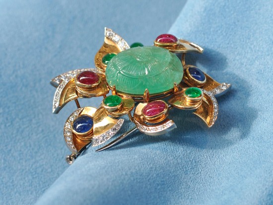 Ogni petalo accoglie luminosi cabochon di Zaffiri, Smeraldi e Rubini, sapientemente alternati per creare un armonioso gioco di colori e riflessi.