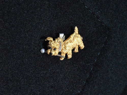 Raffinatezza e simpatia si incontrano in questa esclusiva spilla artigianale che ritrae un fedele compagno, ovvero un piccolo terrier in un momento di gioco.