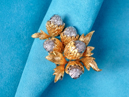 Raffinata spilla anni ’80 raffigurante un elegante intreccio di pigne e foglie, realizzata in oro giallo finemente lavorato. Le superfici cesellate donano profondità e movimento alla composizione, evocando la naturalezza dei dettagli botanici. Le pigne sono impreziosite da diamanti per un totale di 0,5 ct, che aggiungono brillantezza e contrasto alla calda tonalità dell’oro. Un gioiello dal fascino vintage, sofisticato e decorativo, perfetto per valorizzare giacche, abiti o scialli con un tocco luminoso e ricercato.