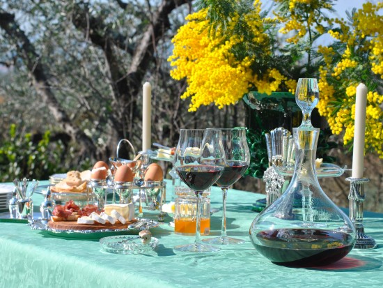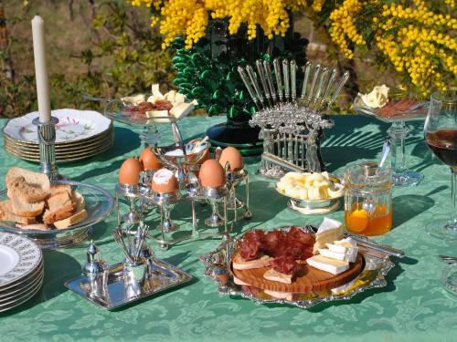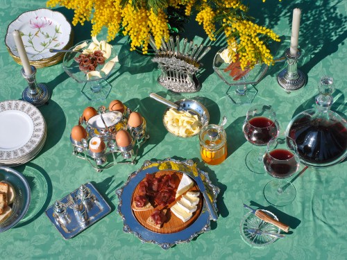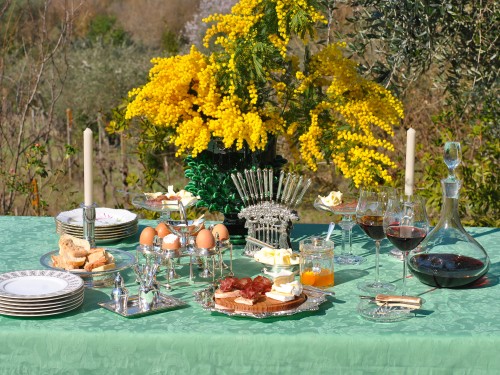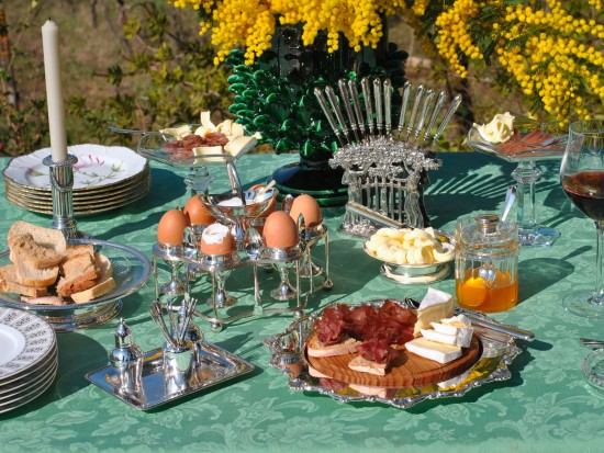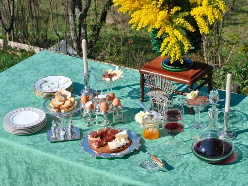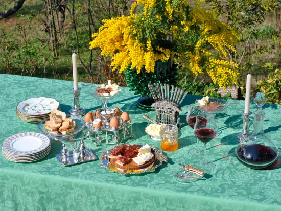 Elegante tavola da aperitivo allestita all’aperto, dove il fascino degli argenti antichi incontra la freschezza di un contesto naturale. Al centro, raffinati accessori in argento portauova, vassoi, posate e contenitori esaltano la cura del dettaglio e il gusto per la tradizione. Il buffet propone una selezione invitante di salumi, formaggi, pane e uova, accompagnati da salse e bevande, disposti con armonia su superfici luminose. Il verde della tovaglia e i fiori gialli donano vivacità alla composizione, creando un equilibrio perfetto tra eleganza classica e convivialità informale.