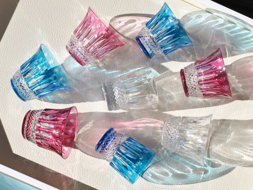 Questi bellissimi bicchieri riflettono, con i loro tagli di stella e diamante, tutta l'abilità e la destrezza dei maestri vetrai di Saint-Louis.