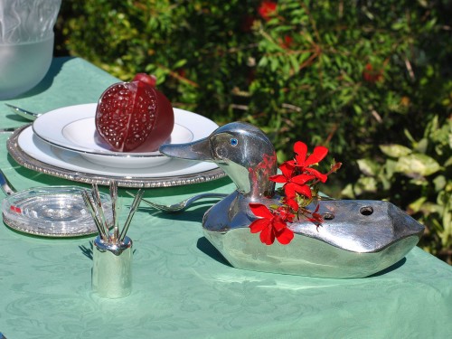 Accanto i calici Lalique si accompagnano ai tumbler in cristallo rosso Baccarat, mentre al centro domina un magnifico centrotavola in argento finemente lavorato del 1920, affiancato da due splendide fioriere antiche in argento.