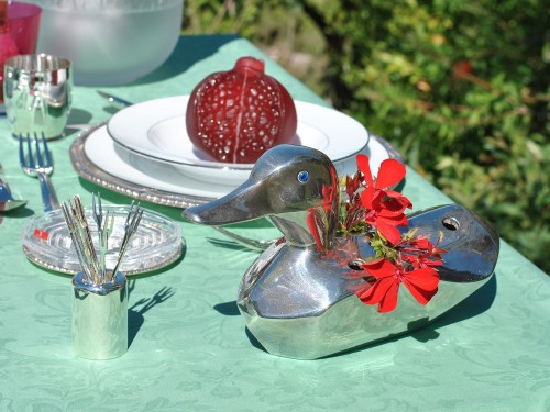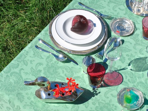 Al lato della tavola il secchio Champagne Bacchantes di Lalique in cristallo satinato, con due divertenti paperelle argentate che si trasformano in originali portafiori e l' iconico vaso Eye rosso Baccarat
