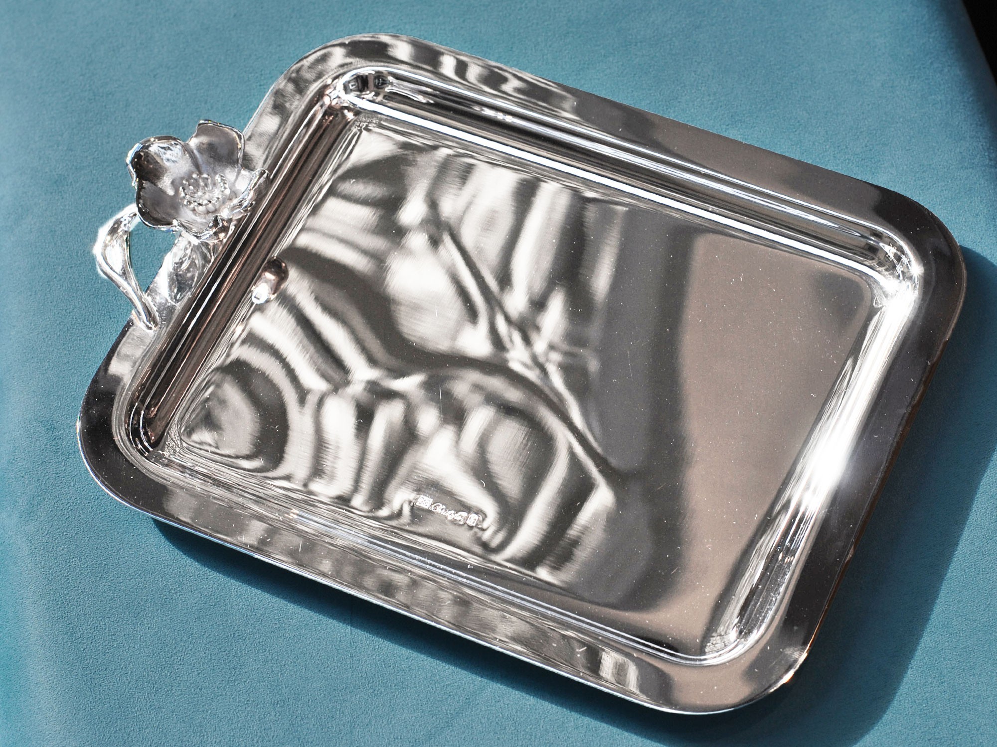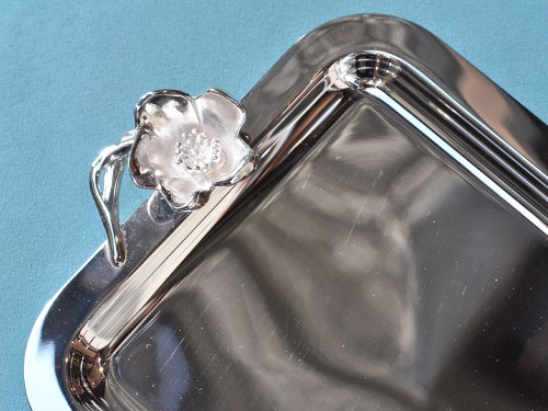Il piccolo vassoio rettangolare placcato argento presenta un elegante manico modellato su un anemone in piena fioritura. La linea Anemone-Belle Époque è una reinterpretazione moderna del movimento Art Nouveau. Caratterizzata da un fiore di anemone finemente cesellato, è ispirata ai fiori che adornavano le bottiglie di champagne Perrier-Jouët del vetraio Emile Gallé all'inizio del 1900.